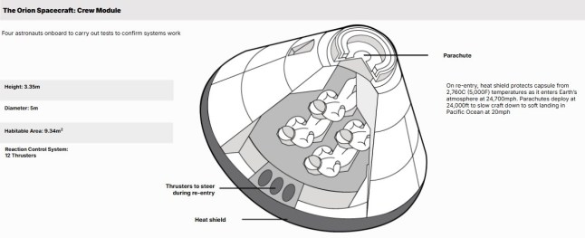 The Orion capsule is about the size of a minivan (Picture: Metro)Nasa officials are confident that the crew will remain alive and comfortable as they splash down,with inspections using cameras on the craft showing nothing to worry about.As the capsule bobs about in the ocean,the final phase of the mission will begin: the recovery.The USS John P. Murtha,a dock ship,will bring the crew to land. Once they have their feet on the ground for the first time in 10 days,they will be flown by helicopter to Naval Air Station North Island before being flown to Houston.A big health worry will be the radiation constantly being spat out by the sun. On Earth,the planet’s magnetic field keeps us safe from it.